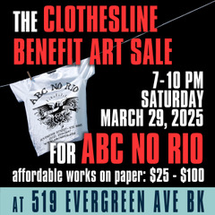On March 29th, ABC No Rio will reprise its Clothesline Benefit Art Sale. We will hold this year's benefit at 519 Evergreen Ave in Bushwick.